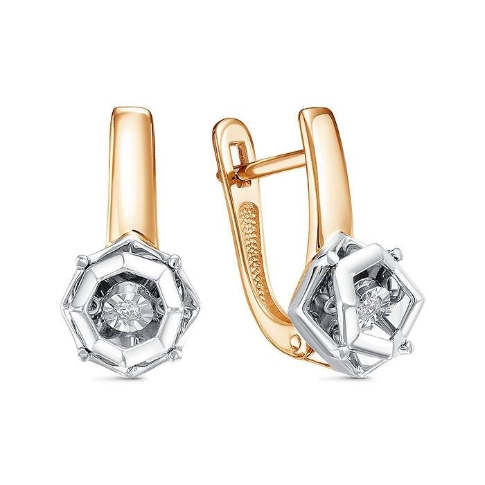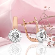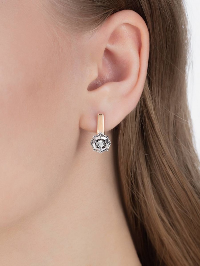 Pendientes de oro Dancing Diamond 585 oro ruso. Dancing Diamond: aretes encantadores y sensuales en oro rojo ruso de 14k con diamantes brillantes sobre un fondo de oro blanco con talla de diamante.