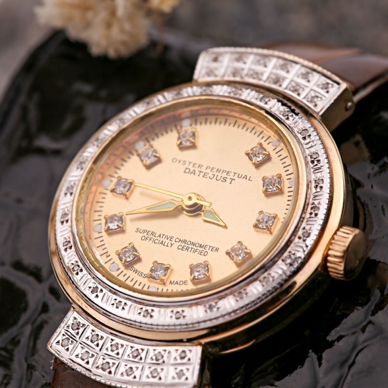Elegante reloj mecánico dorado. La pulsera es de cuero, la caja es de oro rojo y blanco 585 con inserciones de encantadores diamantes. Llevar un reloj de este tipo significa demostrar buen gusto y atención al detalle.
