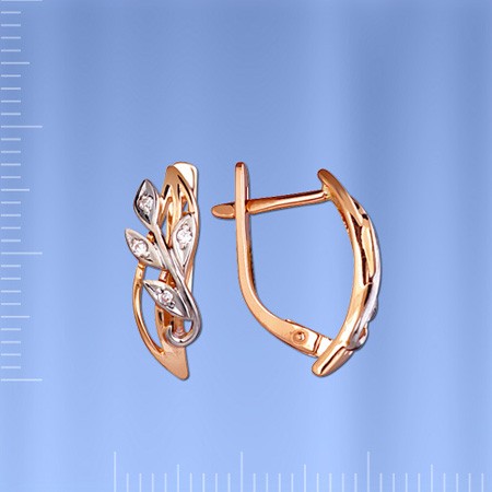 Vene punasest/valgest kullast 585° kõrvarõngad fianiitidega Ø 1 mm. Kõrgus ca 17 mm. Laius ca 5 mm.