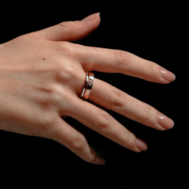 Ostke naiste sõrmuse kullast tsirkooniumoksiidist Internetist. See 585 punasest kullast valmistatud sõrmus avaldab muljet sooja kulla ja roodiumiga kaetud elementide elegantse kontrastiga. Voolav hõbedane joon raamib keskse südamemotiivi ning annab disainile dünaamilisust ja kergust.
