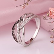Osta naiste hõbesõrmus 925. Elegantne 925 hõbedast valge ja musta tsirkooniumoksiidiga sõrmus avaldab muljet oma kaasaegse disaini ja kivide stiilse kontrastiga. Mitmed kumerad hõbedased jooned põimuvad harmooniliselt ja moodustavad ilmeka kolmemõõtmelise kuju.