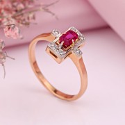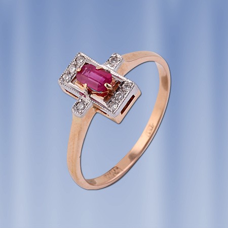 Bague en or avec diamants et rubis. L'or russe en Allemagne. La bague est en or rouge russe 14 carats avec des accents de diamants, de rubis et d'or blanc. Cette bague est le complément parfait à l'image d'une femme élégante qui aime changer d'apparence. Expressive et sophistiquée, la bague convient aux femmes de tous âges qui apprécient les designs intéressants et les pierres impeccables. L'or blanc met en valeur la beauté des diamants d'une manière particulière. Bien sûr, chaque femme rêve d’un cadeau aussi inoubliable et inspirant !