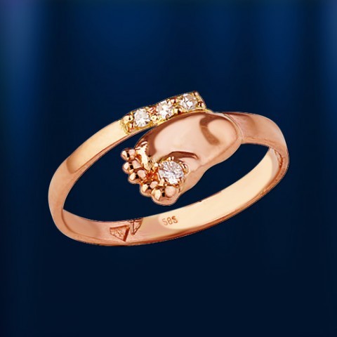 Le talon avec anneau doré est très mignon. Une décoration particulièrement sophistiquée est un diamant en forme de fleur attaché aux doigts. Ring Heel Baby sera un cadeau unique le jour de la naissance de votre premier enfant. C'est une décoration de l'amour et de la gratitude d'une jeune maman pour la naissance de son bébé. Or rouge 585°