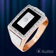 Bague pour homme en or rouge russe 585°, associé à de l'or blanc. Décoré de fianite noire et de zircons. La bague a un extérieur hautement poli. La surface intérieure de la bague est estampillée d'une finesse d'or.