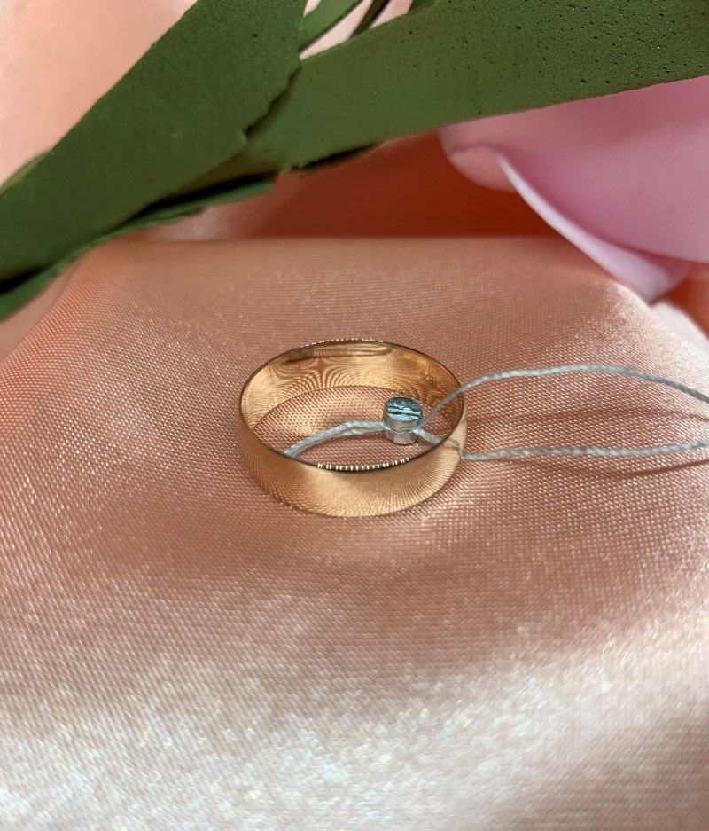 L'anneau a une surface externe polie miroir. Sur la surface intérieure de l'anneau est appliqué le poinçon avec l'échantillon d'or.