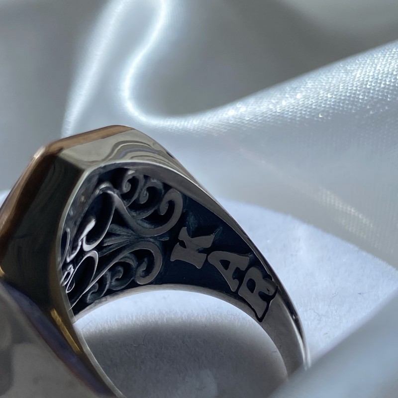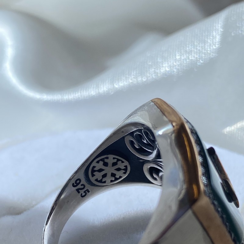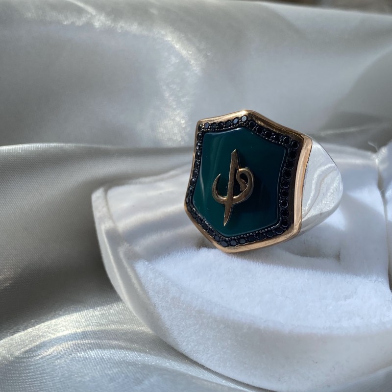 Chevalière massive pour homme en argent sterling 925 avec symbole Elif Vav en relief plaqué or. Sur un fond d'agate verte dans un cadre plaqué or avec des inserts en zircone noire, le motif argenté est particulièrement impressionnant. L'intérieur de la bague est décoré de motifs en filigrane. Chaque homme veut avoir son propre accent élégant, une chose coûteuse qui met l'accent sur le statut.