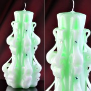Bougie en paraffine. La hauteur de la bougie est d'environ 25 cm, le diamètre inférieur est d'environ 10 cm, le diamètre supérieur est de 7 cm.