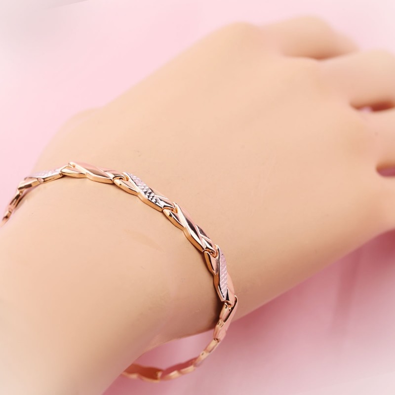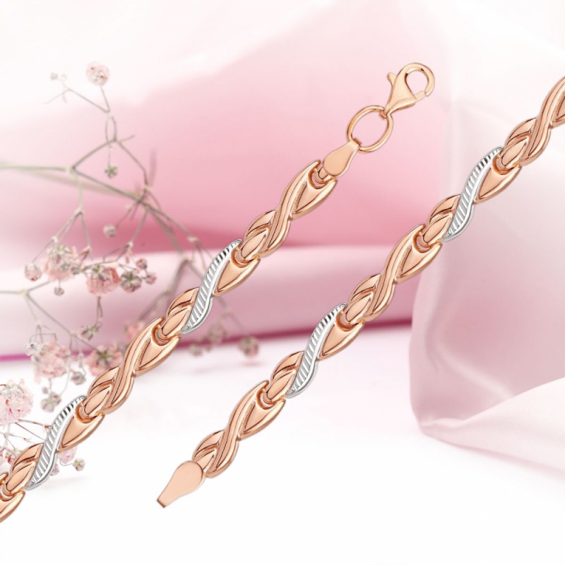 Bracelet d'or femmes russe or 585 ° Bicolor. Le bracelet gracieux et volumineux fait de 585 or blanc et or rouge avec une coupe de diamant étincelante. L'intérieur du bracelet est lisse avec une surface miroir. Les supports en or sont en train de régler l'accent nécessaire dans l'image et attirent l'attention sur la richesse et le luxe des accessoires, car l'or est beau, élégant, chic et cher. Convient à la fois une femme solide et une jeune femme.