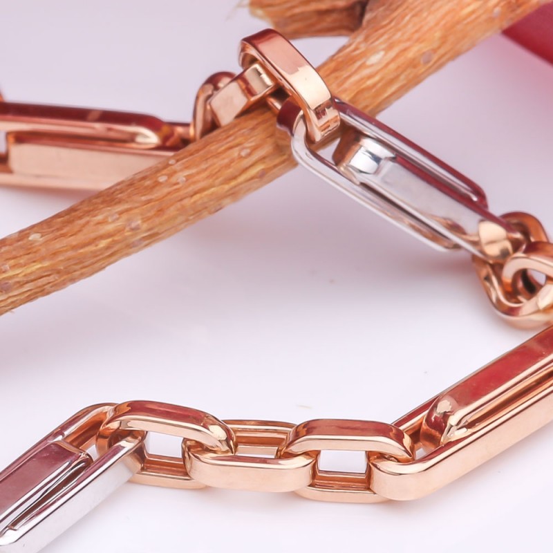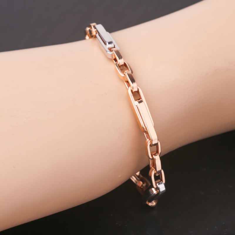 Grâce aux technologies de fabrication modernes, le bracelet semble volumineux et solide, mais reste relativement léger et très agréable à porter. Le contraste des couleurs dorées souligne la géométrie des maillons et assure un élégant reflet de la lumière.