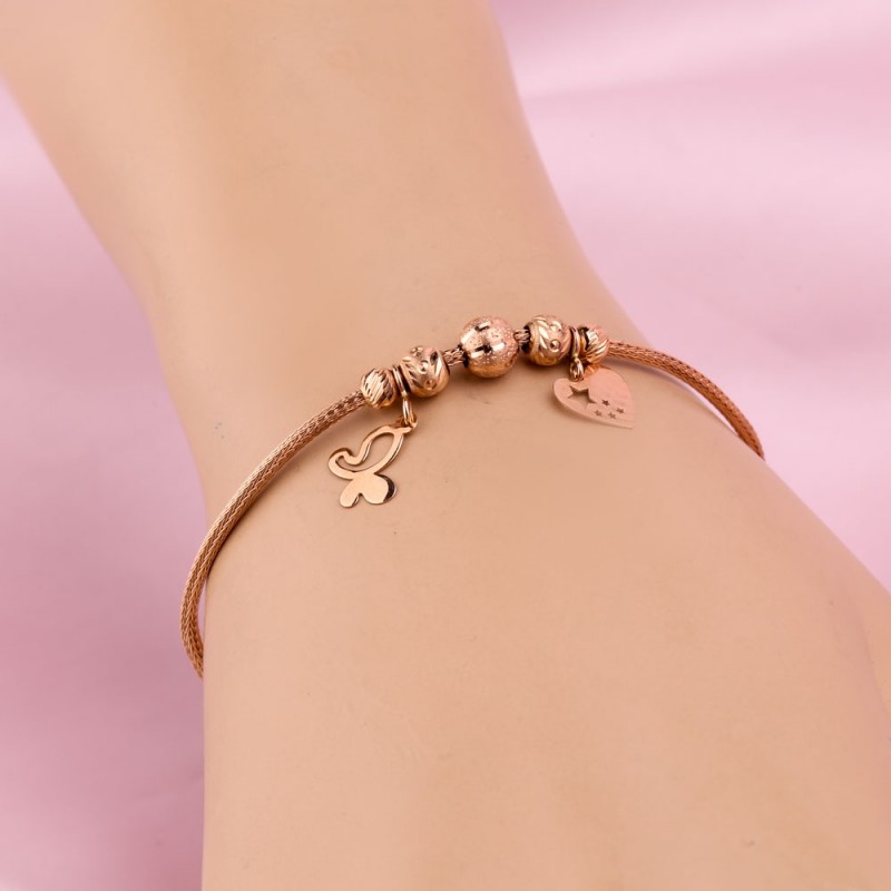 Bracelet Zolotoy Berlin élégant et féminin en or rouge 14 carats en forme de cordon avec de charmants pendentifs. Grâce à la taille du diamant, les pendentifs ont reçu un motif original. Un tel bracelet décorera parfaitement les mains gracieuses des femmes ! Un merveilleux cadeau pour un être cher !