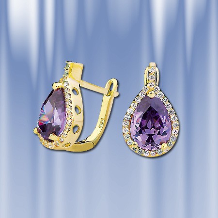 Boucles d'oreilles en or jaune 585° ornées d'améthyste (10x8) mm et de zircons, qui sont une parfaite imitation d'un diamant. Ces boucles d'oreilles éblouissantes vous surprendront par leur beauté et leur élégance. Hauteur environ 16 mm. Avec une fermeture sûre et fiable.