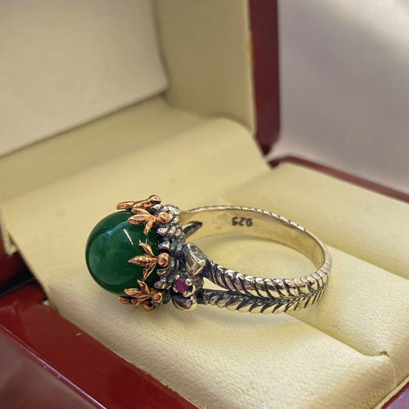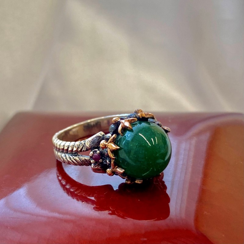 Bague ethnique chic de style Ottoman, réalisée à la main en argent 925 noirci avec un large insert de chrysoprase et de délicats rubis ! La circonférence de la bague est décorée d'un motif en relief ajouré en bronze noble et en argent noirci, qui souligne le style antique du produit. Les femmes tentent depuis longtemps de mettre en valeur leur beauté, leur fragilité et leur charme avec des bijoux. Les bijoux orientaux pour femmes ont de nombreux visages. Ils peuvent refléter à la fois la grâce et la modestie ainsi que l'extravagance de l'image.