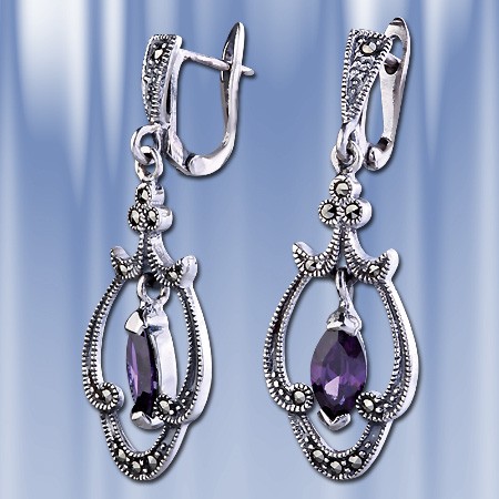 Boucles d'oreilles en argent 925 noirci ornées d'améthyste synthétique et de marcassite. Boucles d'oreilles avec une serrure anglaise.