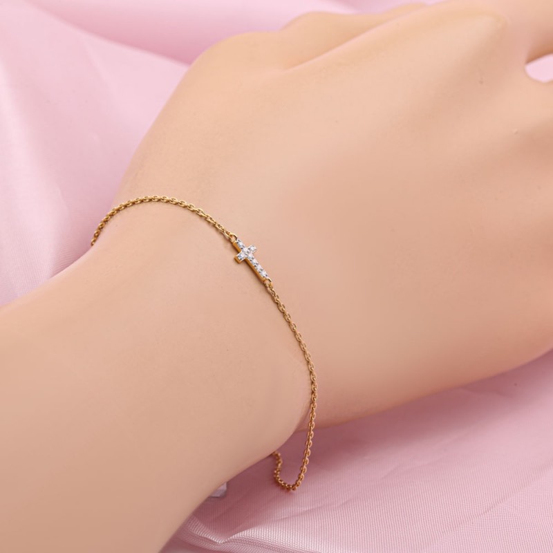 Bracelet SOKOLOV en or jaune avec diamants en or jaune d'Allemagne 585 Swarovski® Diamonds CD. Bracelet délicat et romantique en or jaune 585 avec diamants Swarovski® CD cultivés artificiellement. Un merveilleux cadeau pour votre proche qui mettra en valeur sa féminité et sa beauté, ainsi que l'immuabilité de vos sentiments ! La chaîne est une tresse d'ancre. Plaqué rhodium !