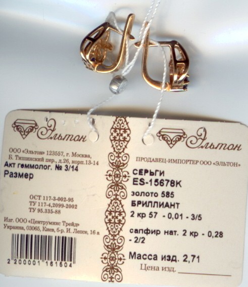 Betétek: Gyémántok 2Kr57 0,01 3/5; természetes kék zafír 2Kr 0,28 2/2