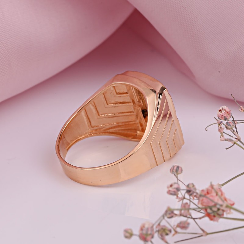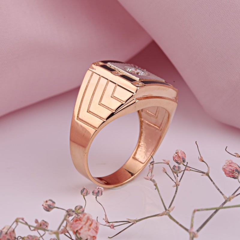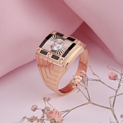 Férfi gyűrű aranyból, németországi cirkóniából. Stílusos férfi gyűrű 585-ös vörösaranyból, fehér arany betétekkel, amelyek kiemelik a kövek varázsát. A felső platformot cirkóniából és fekete zománcból készült dekoratív betét díszíti. A gyűrű belső, zárt felületén arany fémjeles bélyeg található.