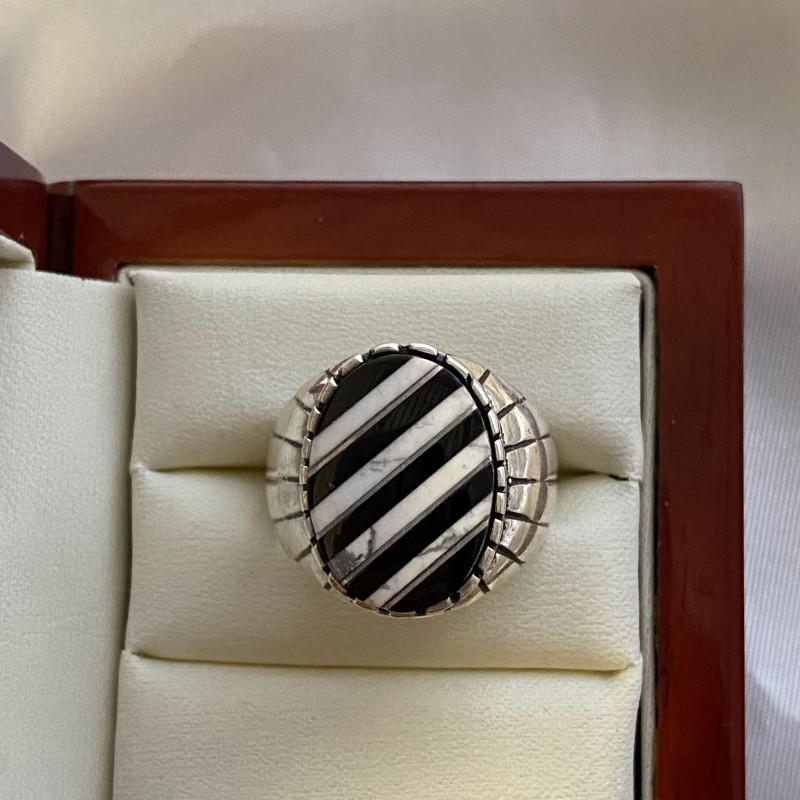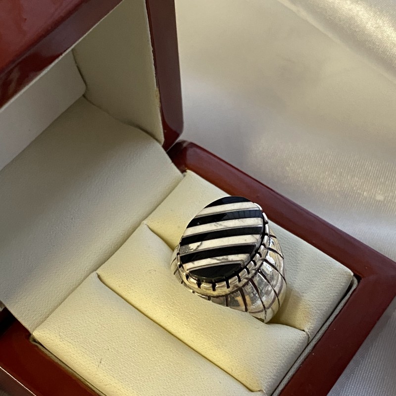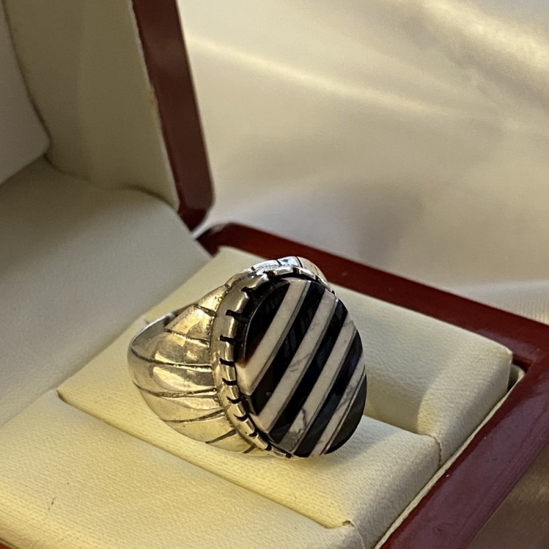 Férfi gyűrű feketített 925-ös ezüstből, fekete-fehér ónixszal. Minden férfi saját stílusos akcentust akar, egy drága holmit, amely kiemeli a státuszt.