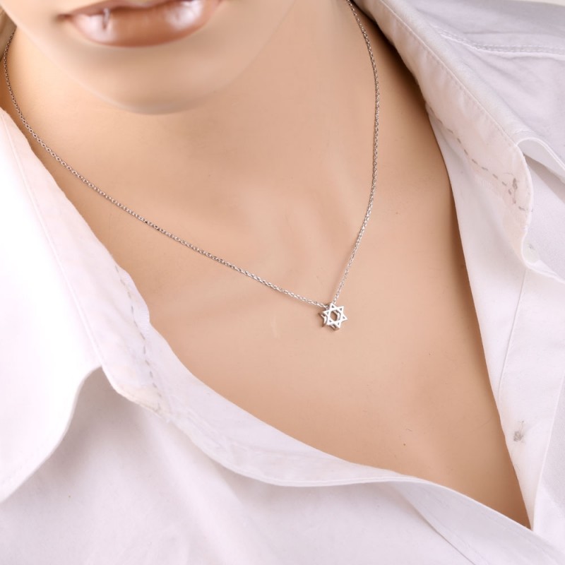 Nyaklánc 925 sterling ezüstből, dekoratív volumetrikus medállal – Dávid-csillag formájú csúszkával. Láncfonás - horgony, gyémánt csiszolás.