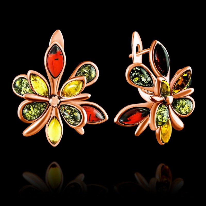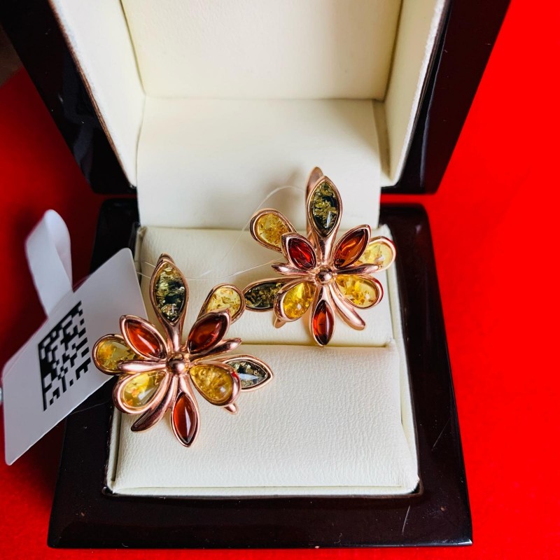 Gyönyörű fülbevaló vörös aranyozott ezüstből 925 minta, borostyán zöld árnyalataiban, konyak és méz, csodálatos "napdarab"! Egyedülálló lehetőség az egyéniség hangsúlyozására, a nőiesség, a napfény és a gyengédség képének közvetítésére.
