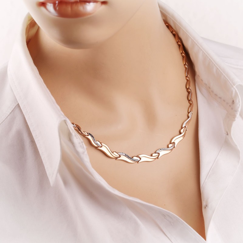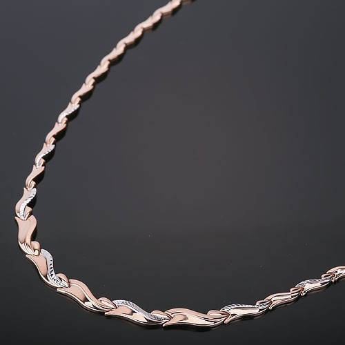 Arany Colier Orosz arany 585 Bicolor. A kecses és terjedelmes arany collier 585 fehéraranyból és piros aranyból, csillogó gyémánt vágással. A nyaklánc belseje sima, tükörfelülettel. Az aranyból készült Collier a képen a szükséges akcentust állította be, és felhívja a figyelmet a kiegészítők gazdagságára és luxusára, mert az arany gyönyörű, elegáns, elegáns és drága. Megfelel egy szilárd hölgynek és egy fiatal nőnek.