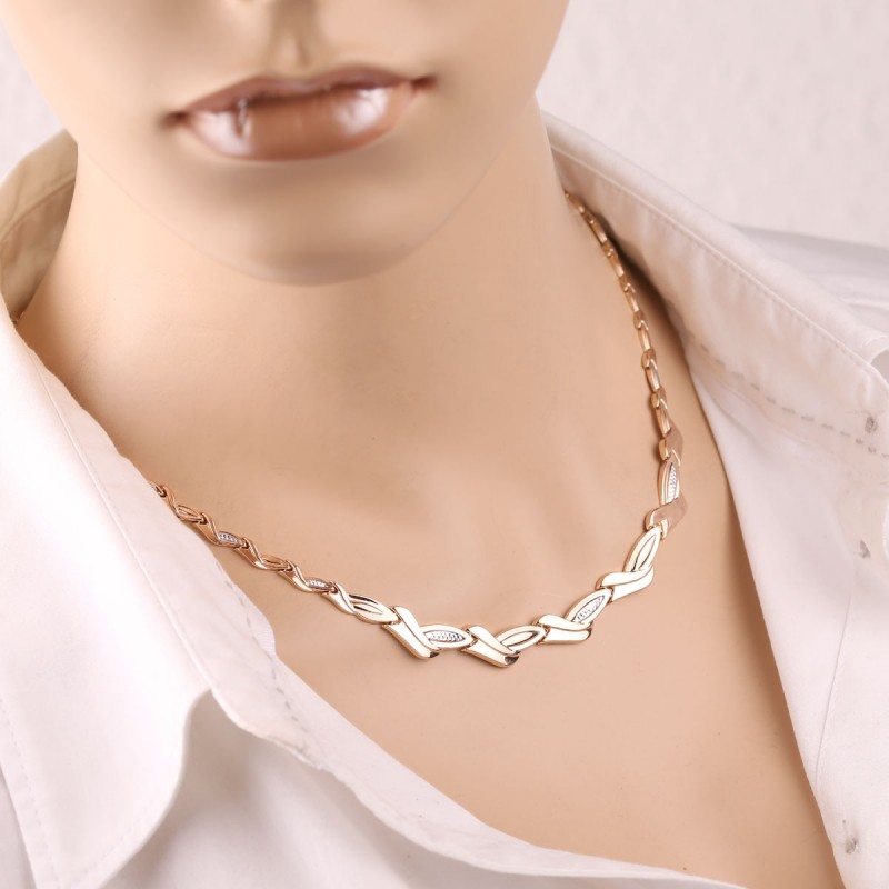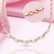 Arany Colier Orosz arany 585 Bicolor. A kecses és terjedelmes arany collier 585 fehéraranyból és piros aranyból, csillogó gyémánt vágással. A nyaklánc belseje sima, tükörfelülettel. Az aranyból készült Collier a képen a szükséges akcentust állította be, és felhívja a figyelmet a kiegészítők gazdagságára és luxusára, mert az arany gyönyörű, elegáns, elegáns és drága. Megfelel egy szilárd hölgynek és egy fiatal nőnek.