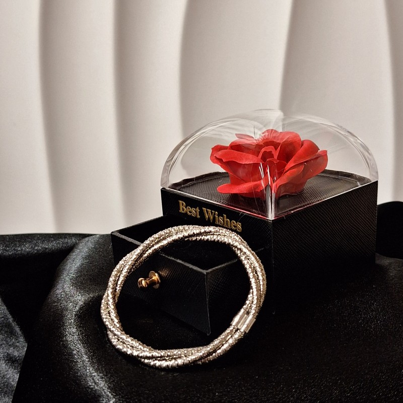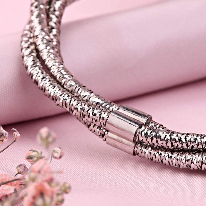 Varázslatos, terjedelmes karkötő, rugalmas és rugalmas, feketézett ezüst 925 ° -os ródiumozással. A karkötőt egy speciális technológiával állítják elő, amelyben az elasztikus zsinór háromszor felfalják és ezüst végekkel vannak rögzítve.