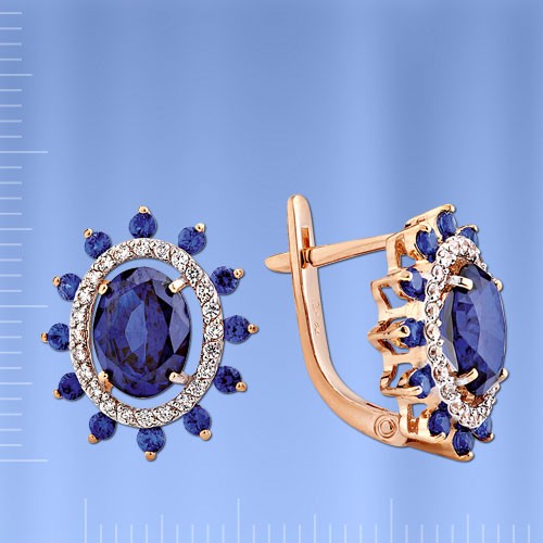 585°-os vörösaranyból készült fülbevaló 2 spinellel (8,0 x 6,0 mm), 24 spinellel ¢ 1,5 mm, fianitokkal ¢ 0,5 mm. Ezek a káprázatos fülbevalók szépségével és eleganciájával ámulatba ejtenek
