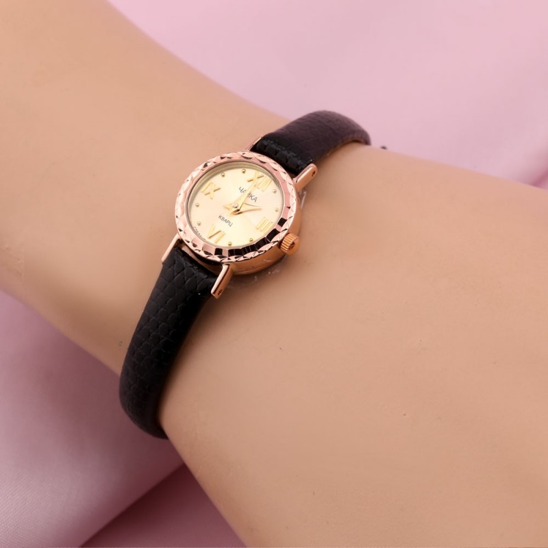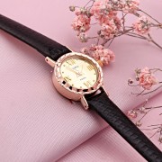 Elegáns arany kvarc óra. A karkötő valódi puha antiallergén bőrből, a tok pedig 585-ös vörös és sárga aranyból készült.