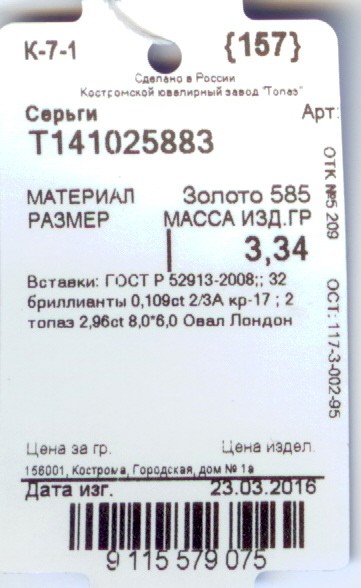 Si tratta di gioielli realizzati in Russia o nei paesi dell'ex Unione Sovietica con vero oro massiccio 585. Ogni prodotto ha i marchi testati dall'Ufficio statale di punzonatura della Federazione Russa. Inoltre ogni gioiello è dotato di etichette sigillate con certificato del produttore.
