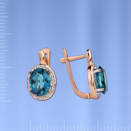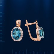 Inserti: 32 diamanti 32Cr17 0,099 ct. 2/3A, 2 grandi topazi London 8,0 x 6,0 mm London Blue ovale 2,96 ct. I topazi sono fissati saldamente con quattro punte d'oro, aperti, alti, forti, che permettono di vedere alla luce il gioco dei topazi da tutti i lati.