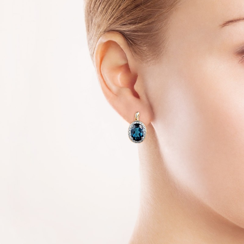 Affascinanti orecchini luminosi e sensuali realizzati in oro bianco e rosa 14k, decorati con diamanti scintillanti e grandi topazi blu Londra blu scuro trasparenti, saranno un regalo di lusso per i tuoi cari. Passano gli anni, cambia la moda, ma gli orecchini d'oro continuano ad attrarre con la loro freschezza e bellezza.