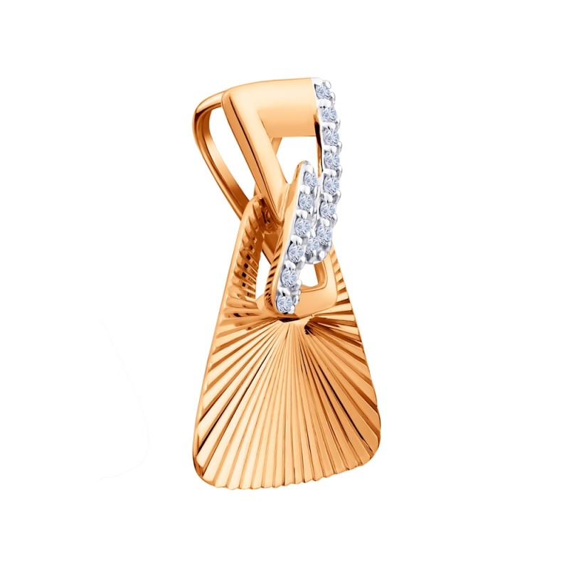 Ciondolo in oro 585 zirconi. Questo ciondolo realizzato in oro rosso 585 colpisce per la sua geometria sorprendente e il gioco di diverse superfici. La base dalla struttura radiosa riflette elegantemente la luce e crea uno scintillio vibrante ad ogni movimento.