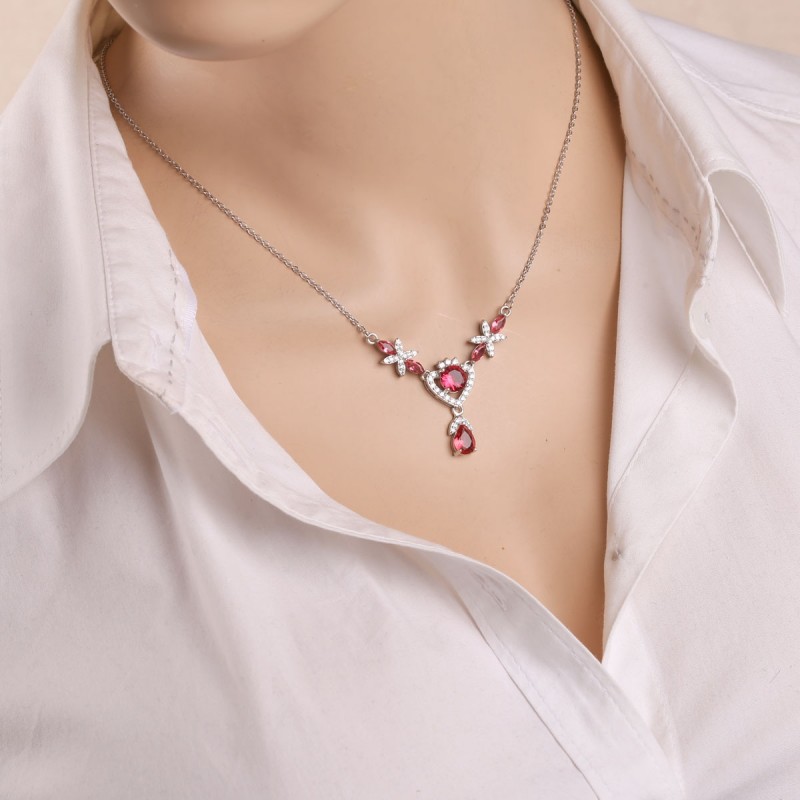 Collana realizzata in argento sterling 925 in Germania. Collana romantica realizzata in argento 925 con zirconi rosso rubino, che colpisce per la sua elegante composizione di forme di cuore e fiore. Al centro del design c'è uno scintillante zircone rosso rubino, che conferisce al gioiello un intenso accento cromatico.