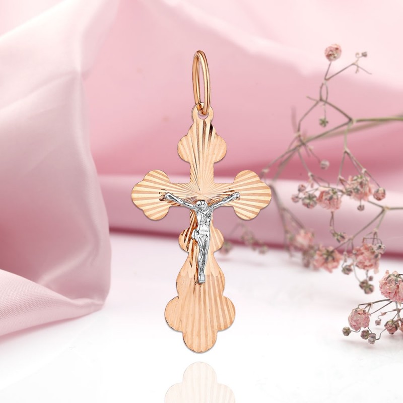 Pendente croce con crocifisso realizzato in oro rosso e bianco 585 con taglio diamante. Sul retro è incisa una scritta in russo: "Salva e preserva". La croce non si graffia durante l'uso.