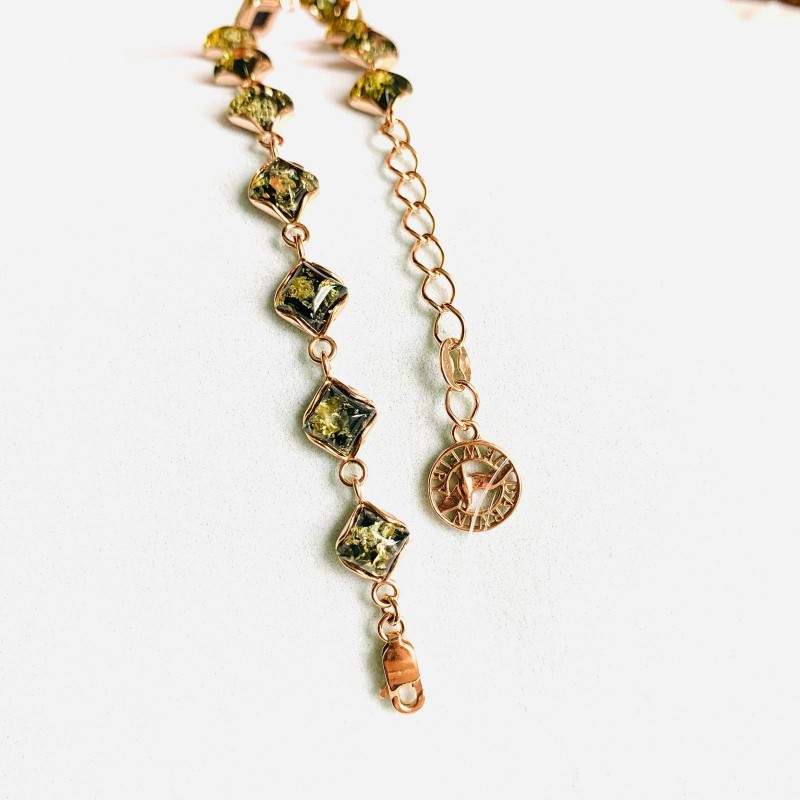 Un magnifico braccialetto in argento 925 placcato oro decorato con ambra verde, con questo fantastico "pezzo di sole", in tutte le sfumature del verde, ti delizierà e delizierà grazie alla sua bellezza! Un'occasione unica per sottolineare la propria individualità, per trasmettere l'immagine di femminilità, sole e tenerezza.