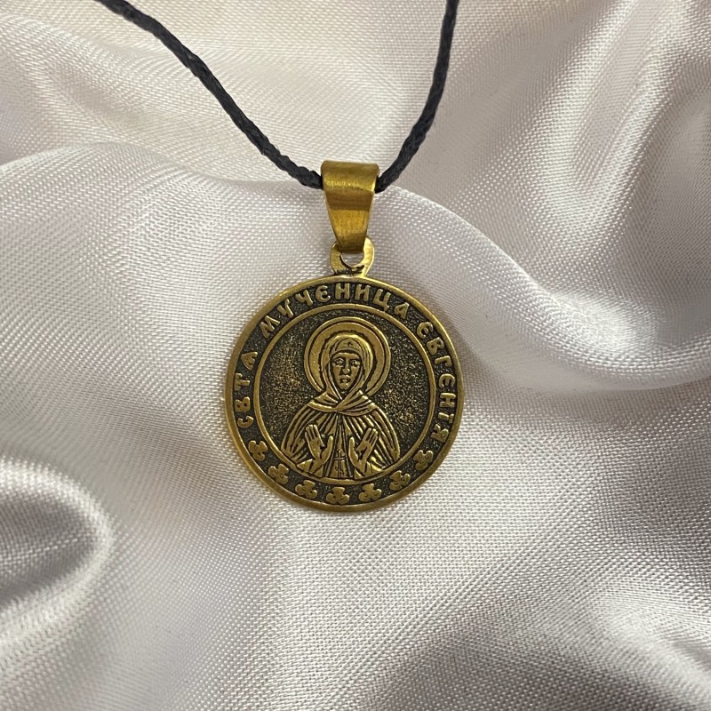 Icona pendente in bronzo su cordone nero resistente.