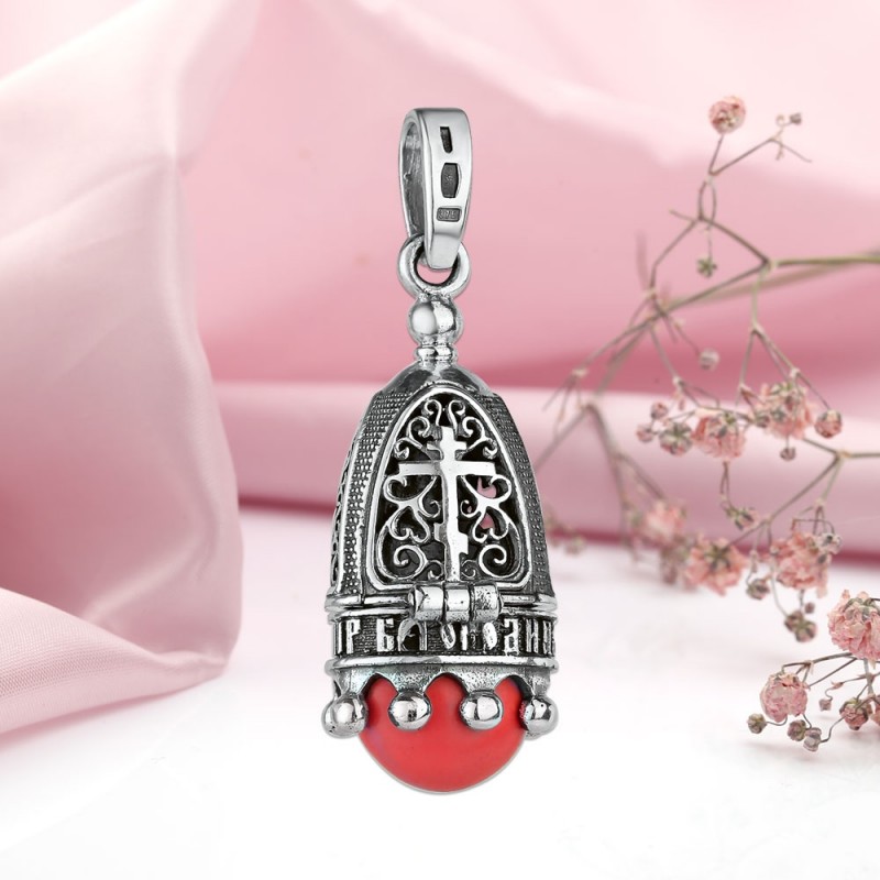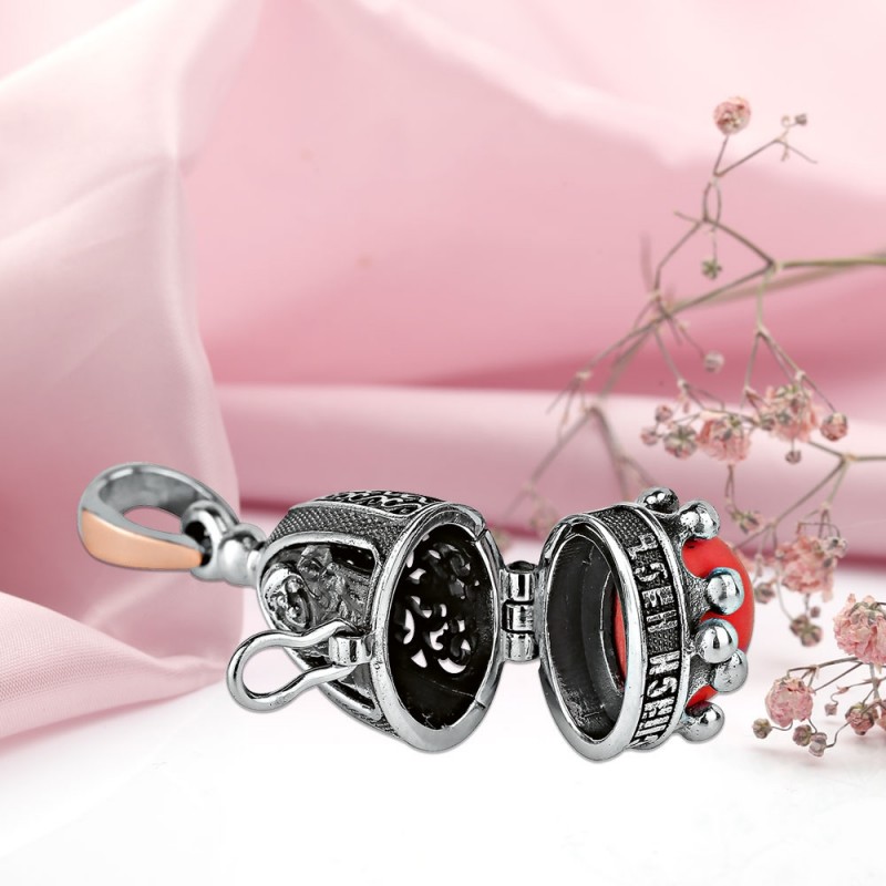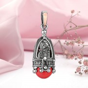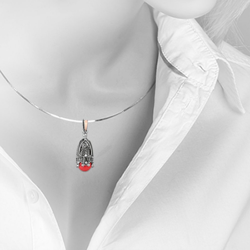Ciondolo in argento - amuleto con un'icona in argento sterling 925 annerito con accenti in oro rosso 375 con inserto in corallo.