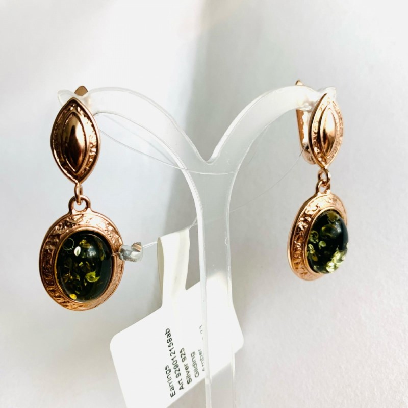 Bellissimi orecchini realizzati in campione d'argento 925, con ambra verde, sorprendente "pezzo di sole" e placcatura in oro rosso! Un'occasione unica per sottolineare la propria individualità, per trasmettere l'immagine di femminilità, sole e tenerezza.
