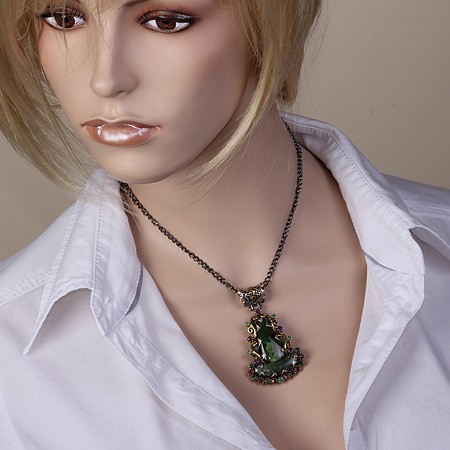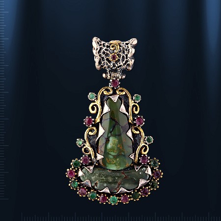 Un ciondolo gioiello elegante e lussuoso realizzato in argento annerito 925 ° con un grande inserimento di turchese iraniano (28 x 14 mm), (10 x 28 mm), splendidamente incastonato da 12 rubini (diametro 2 mm, 3 mm) e 11 smeraldi ( Diametro 2 mm, 3 mm) sono incorniciati. . Altezza 63 mm, larghezza 37 mm
