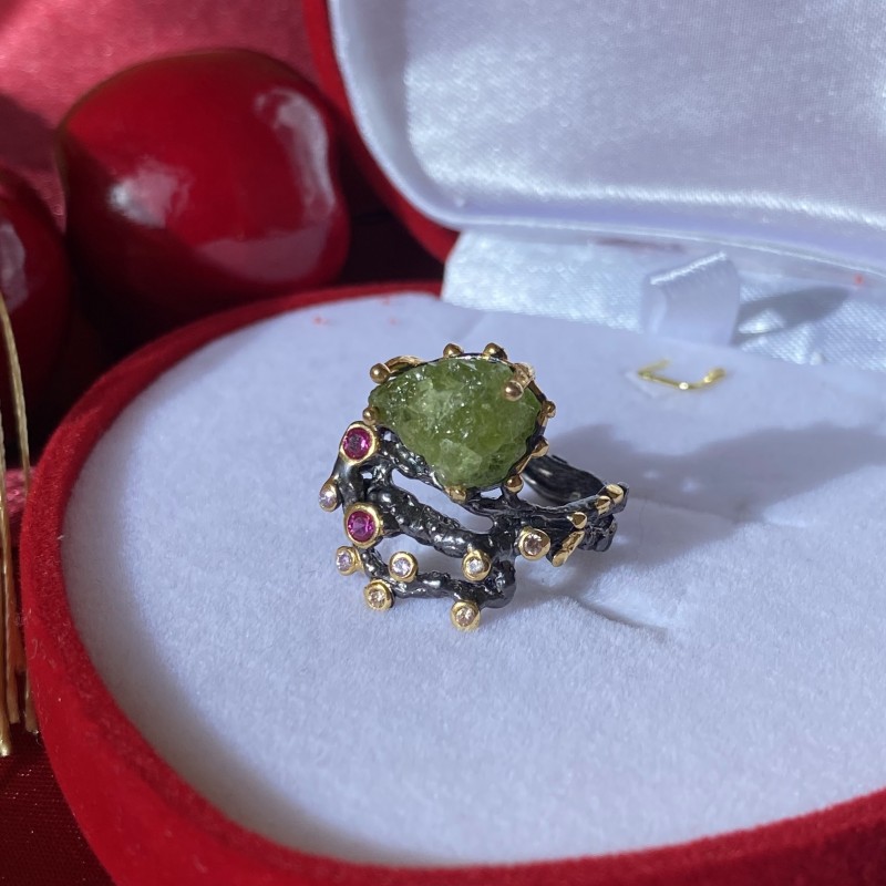 Un affascinante anello in stile ottomano realizzato in argento 925 annerito con placcatura in oro giallo massiccio, decorato con bellissima crisolite e zirconi. Grazie agli accenti sapientemente posizionati utilizzando la placcatura in oro, l'anello sembra straordinariamente bello. Un'eccellente aggiunta alla tua immagine di femminilità e romanticismo.