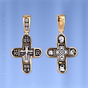 Krustveida kulons no sudraba 925° apzeltīts 999°. Garums ar cilpu aptuveni 32,0 mm, platums apm