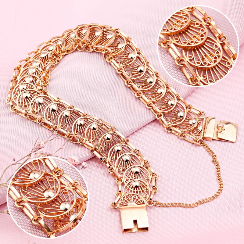 Zelta rokassprādze Krievijas zelts 585 Vācijā. Īpaši eleganta rokassprādze no 585 sarkanā zelta, kas veidota smalkā, gandrīz mežģīnēm līdzīgā tehnikā, kas atgādina smalkas, mākslinieciski atvērtas vēdekļus vai mazas ziedlapiņas. Katru segmentu akcentē pulēta, atstarojoša baltā zelta lodītes — kā mīksts gaismas punkts, kas iedegas ar katru kustību.