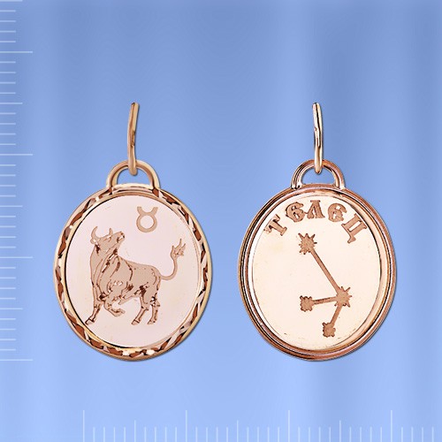 Vērsis", kas izgatavota no Krievijas sarkanā zelta 585°. Augstums ar cilpiņu aptuveni 25,0 mm. Platums aptuveni 15,0 mm