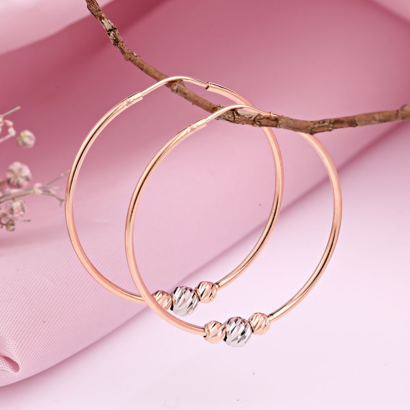 Krievu zelta 585 zelta Kongo auskari 32 mm. Eleganti stīpiņu auskari no 585 sarkanā zelta, dekorēti ar dimantā grieztām bumbiņām, pasvītro tavu sievišķību un grāciju.