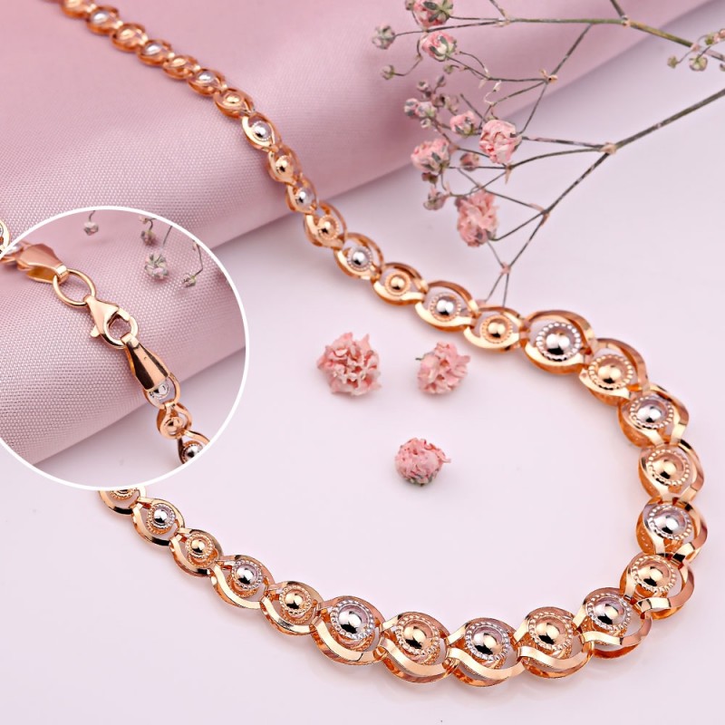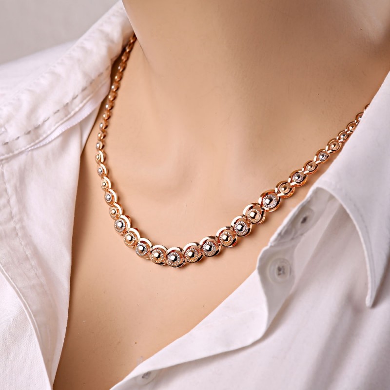 Burvīga apjomīga kaklarota no 585 sarkanā un baltā zelta, kas izgatavota fantāzijas aušanā! Izcili mirdzošs un dzirkstošs gaismas staros, tas piesaista uzmanību ar savu unikālo rakstu.