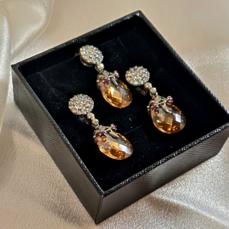 Komplekts, kas izgatavots no 925 sudraba citrīna cirkonija rubīna. Šiks etniskais komplekts Osmaņu stilā ar rokām darināts no melnā 925 sudraba ar lielu citrīna, dzirkstošā cirkonija un rubīna izmantošanu. Komplekts sastāv no piekabes un auskaru ar angļu pili.