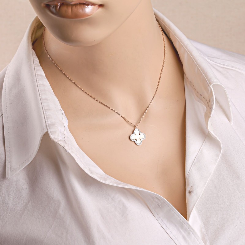 ► Sarkanā zelta kaklarota ar dimantiem un četru lapu motīvu — elegantas rotaslietas ar simbolisku nozīmi un greznu spīdumu!