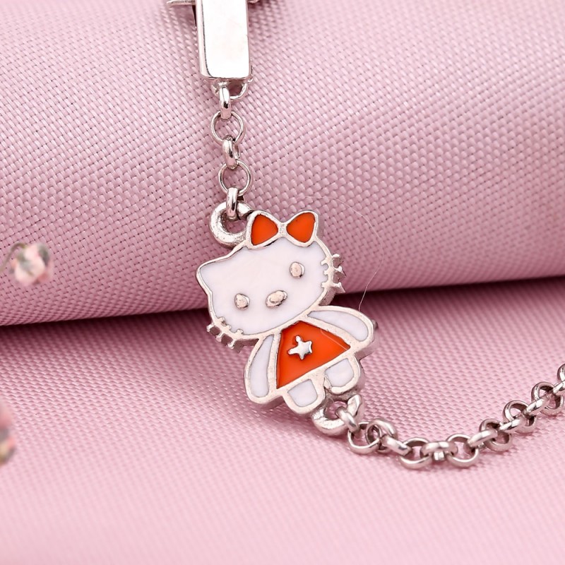 Kinderarmband van 925 zilver met een plaatje voor het graveren van een naam of geboortedatum, versierd met een geëmailleerde kattenfiguur. Ankerketting