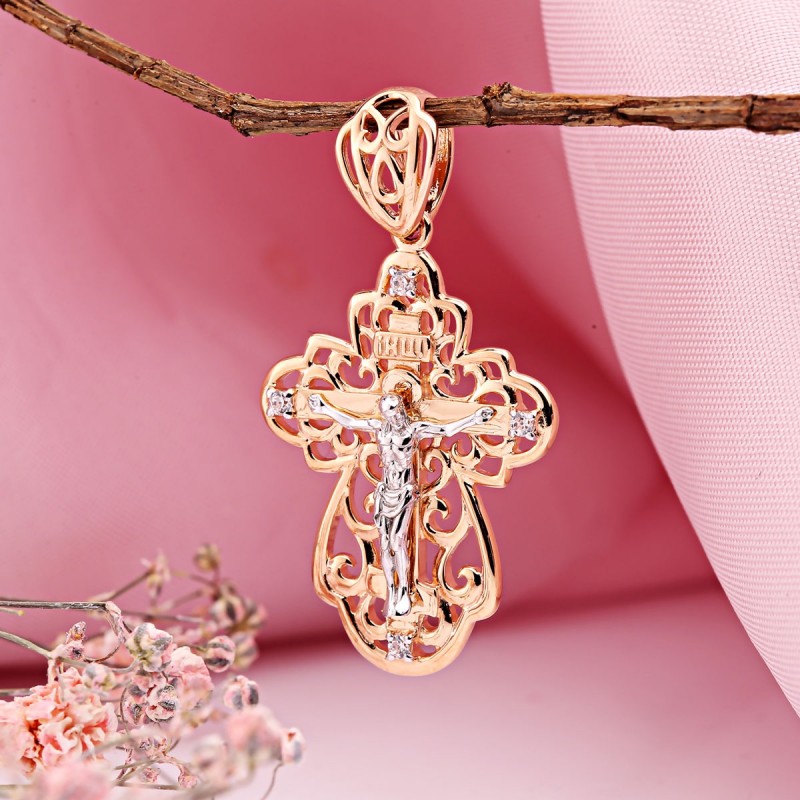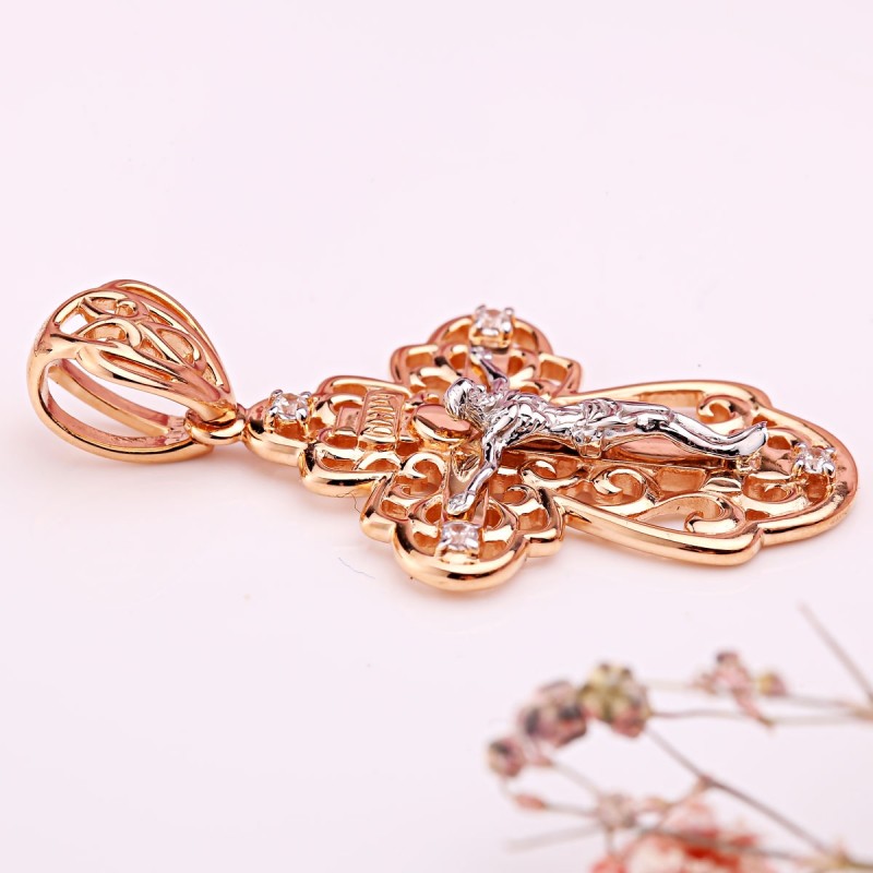 Kruishanger met kruisbeeld 585. Kruis met lichaam van 585 goud in tweekleurig ontwerp. De body is gemaakt van een combinatie van roodgoud en witgoud. Het kruislichaam is gemaakt van rood goud en heeft een opengewerkte (filigraan) constructie. Het lichaam (Christusfiguur) is gemaakt van wit goud. "IНЦI" is op de voorkant gegraveerd en "Save and Preserve" in het Russisch op de achterkant.