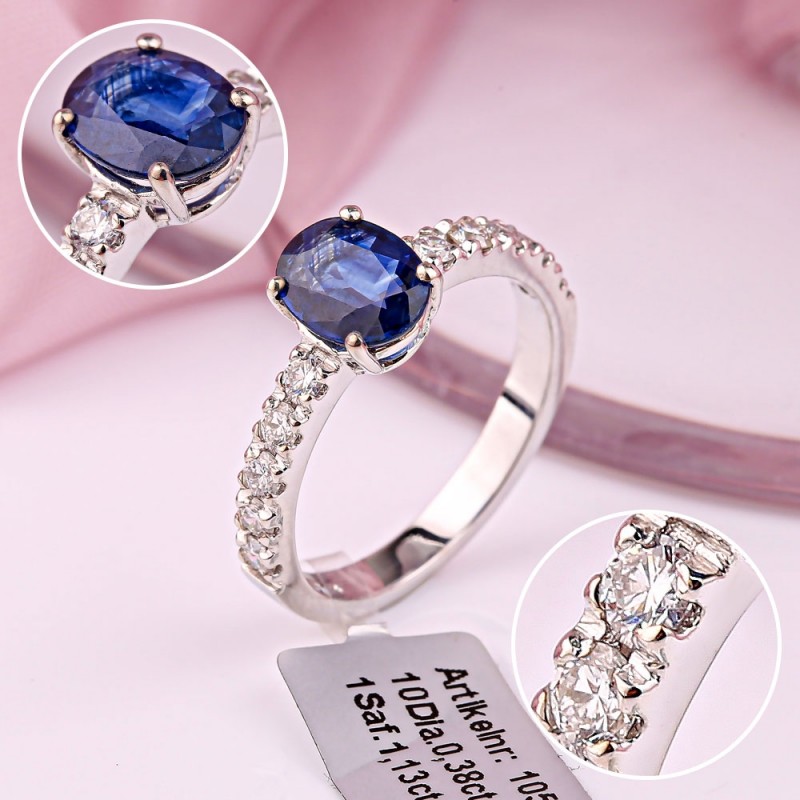 Inzet: 10 diamanten 0,38 ct. G-si Ø 2,0 mm; 1 saffier ovaal 1,13 ct. 8,0 x 6,0 mm